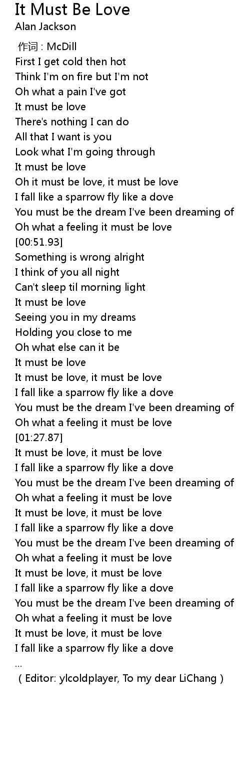 Don Williams-It must be love(lyrics), . We Have got 15 images about It Must Be Love Lyrics images, photos, pictures, backgrounds, and more. In such page, we additionally have number of images out there. Such as png, jpg, animated gifs, pic art, symbol, blackandwhite, pics, etc. "Enrique Iglesias - It Must Be Love (Lyrics)", Enrique's first song in 2010 :) I added the lyrics on video too :D Enjoy it! It must be love There is something I gotta tell you It goes . "Alan jackson It must be love lyrics", I don't own a thing. Just a fan!!..